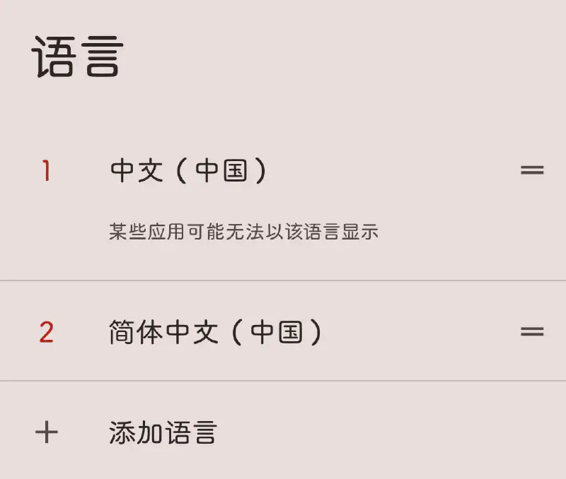 在类原生系统的初次开机设置时,如果检测到国内SIM卡,系统会自动将语言切换成 中文(中国) ,而这个语言在系统的 添加语言 列表里面是没有的,你只能找到 简体中文(中国)